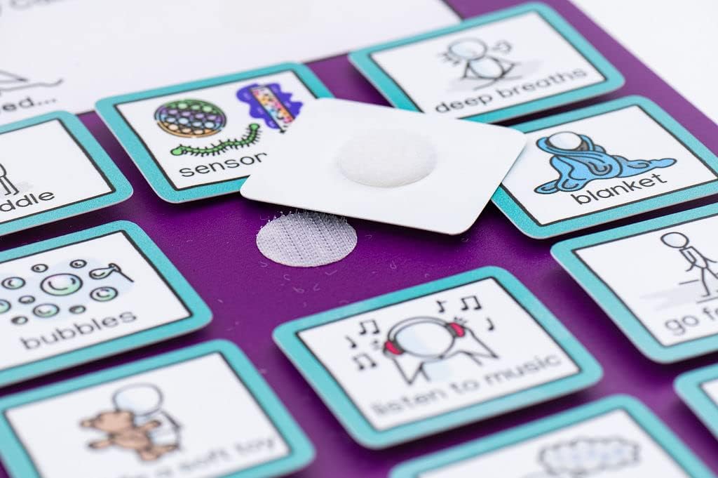 - Visual aids or calming stickers are attached to the board with VELCRO Brand hook and loop, allowing someone to easily move them to the top of the chart to communicate their choice.