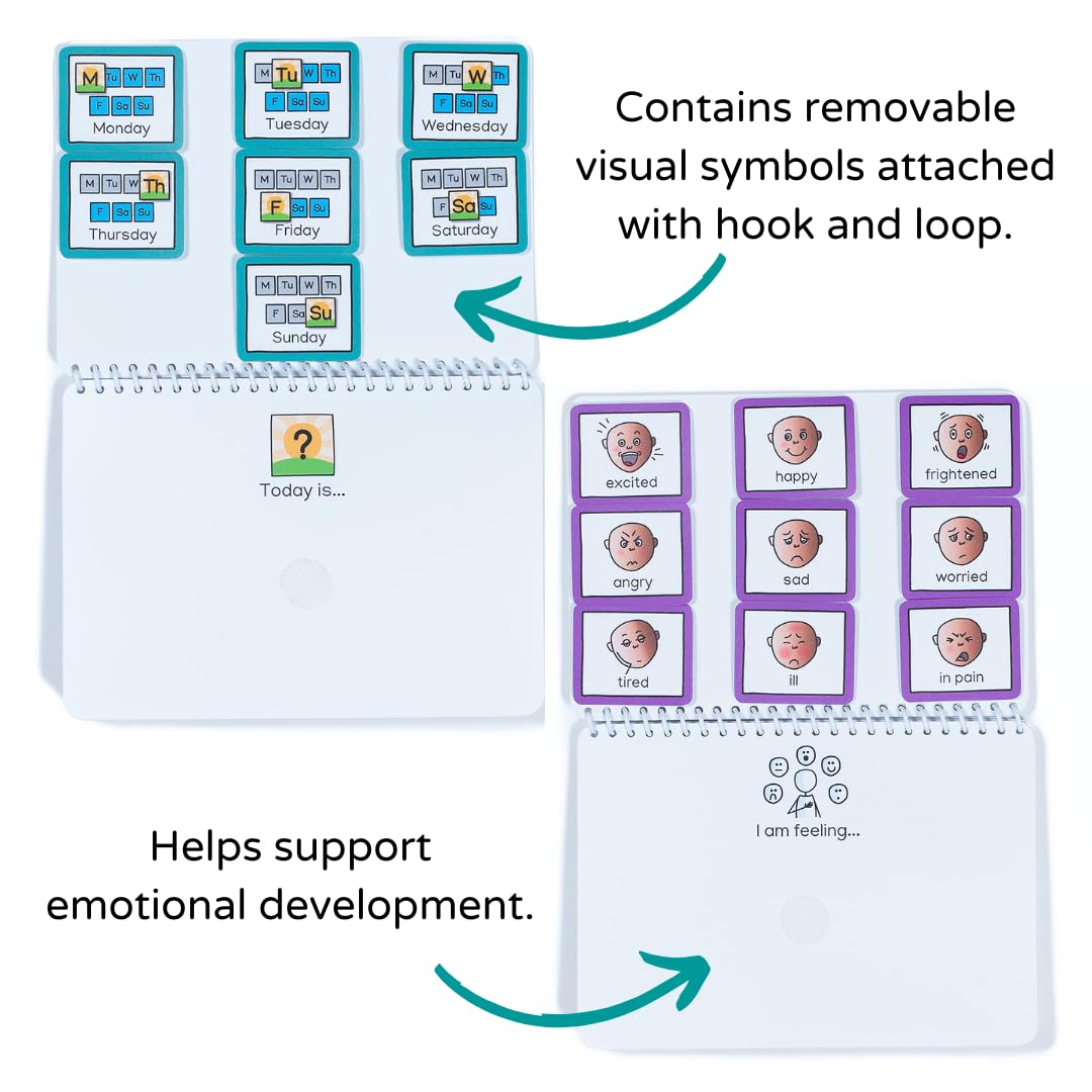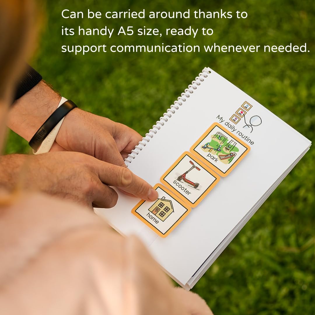 - This handy A5 book combines 6 different communication resources, allowing someone to be communicated to, and be able to communicate with others, thanks to the removable visual symbols.