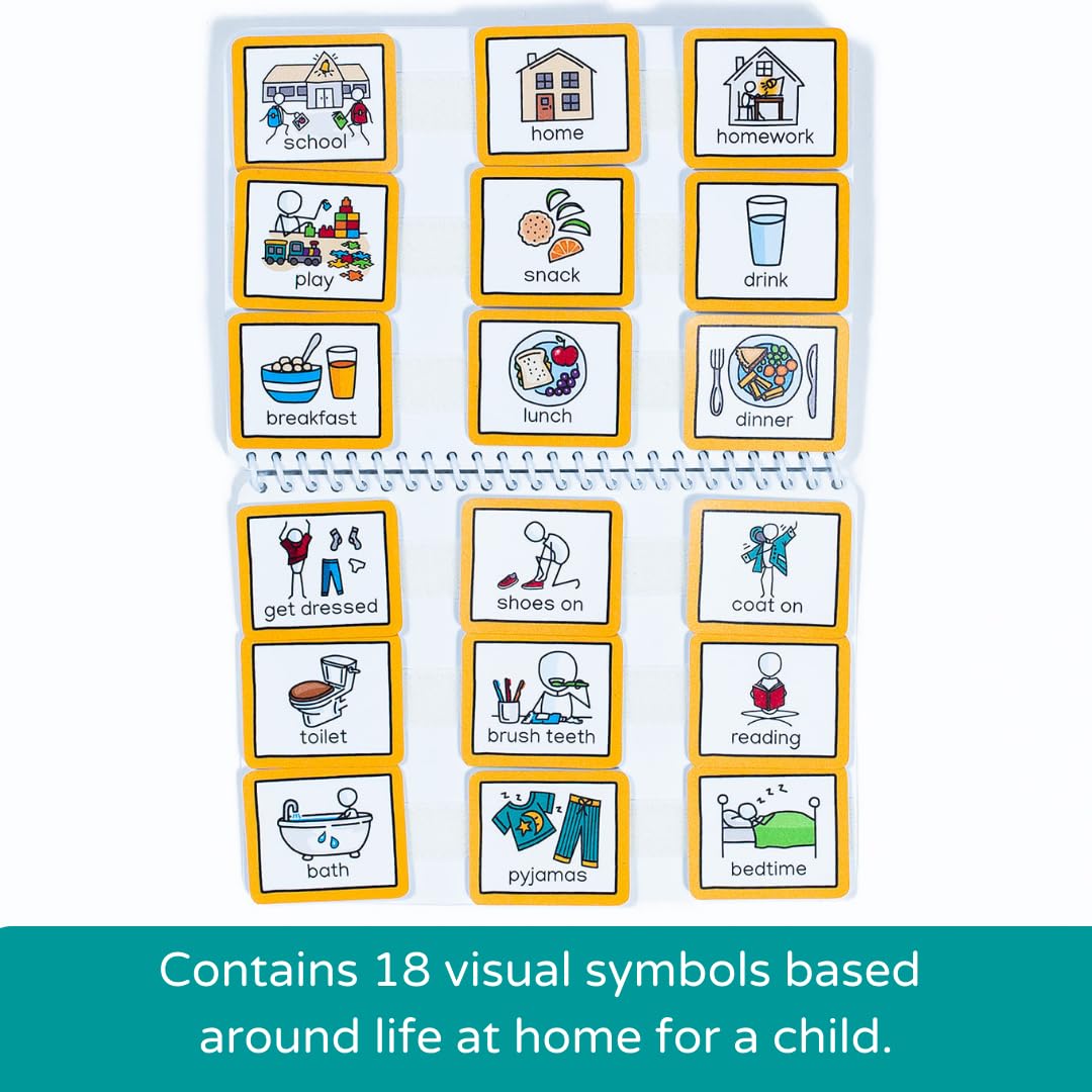 - Besides the days of the week visuals and the 9 feelings visuals, the 18 visual symbols at the back are based around life at home for a child.