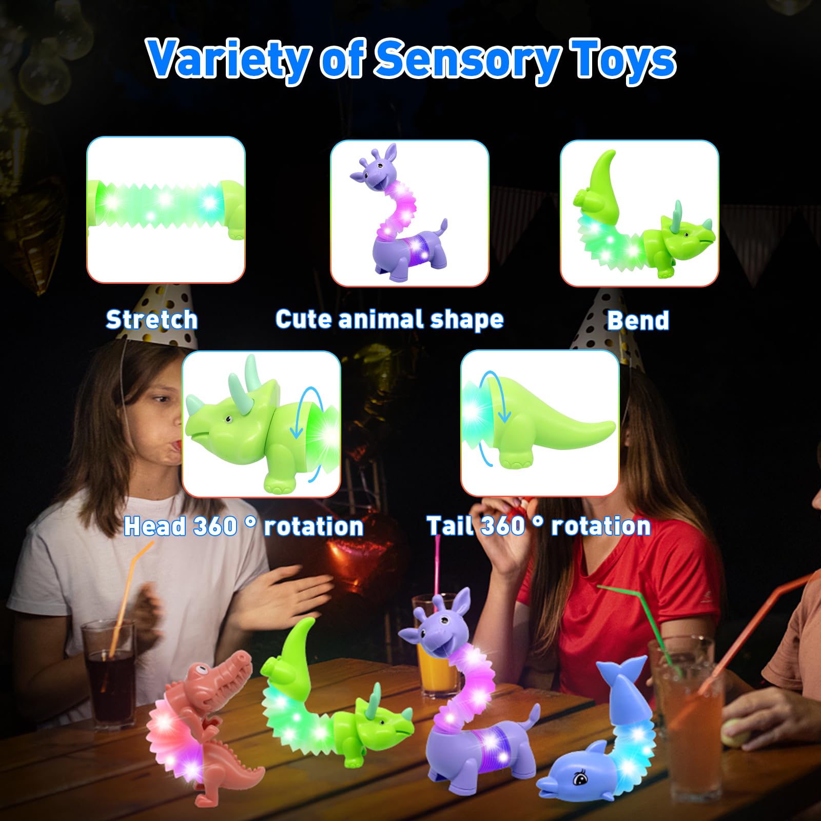 - 🌟【LED Sensory Light Toy】 Newest glow in the dark party supplies.The main body of this sensory toy is made of a burst tube, with built-in flashing LED, which can be freely retracted and deformed with the burst sound. The amazing display of lights and colors will definitely impress your children and ensure that there are countless interesting moments during the day and night! The head, tail and body can stretch or twist 360 degrees at will.
