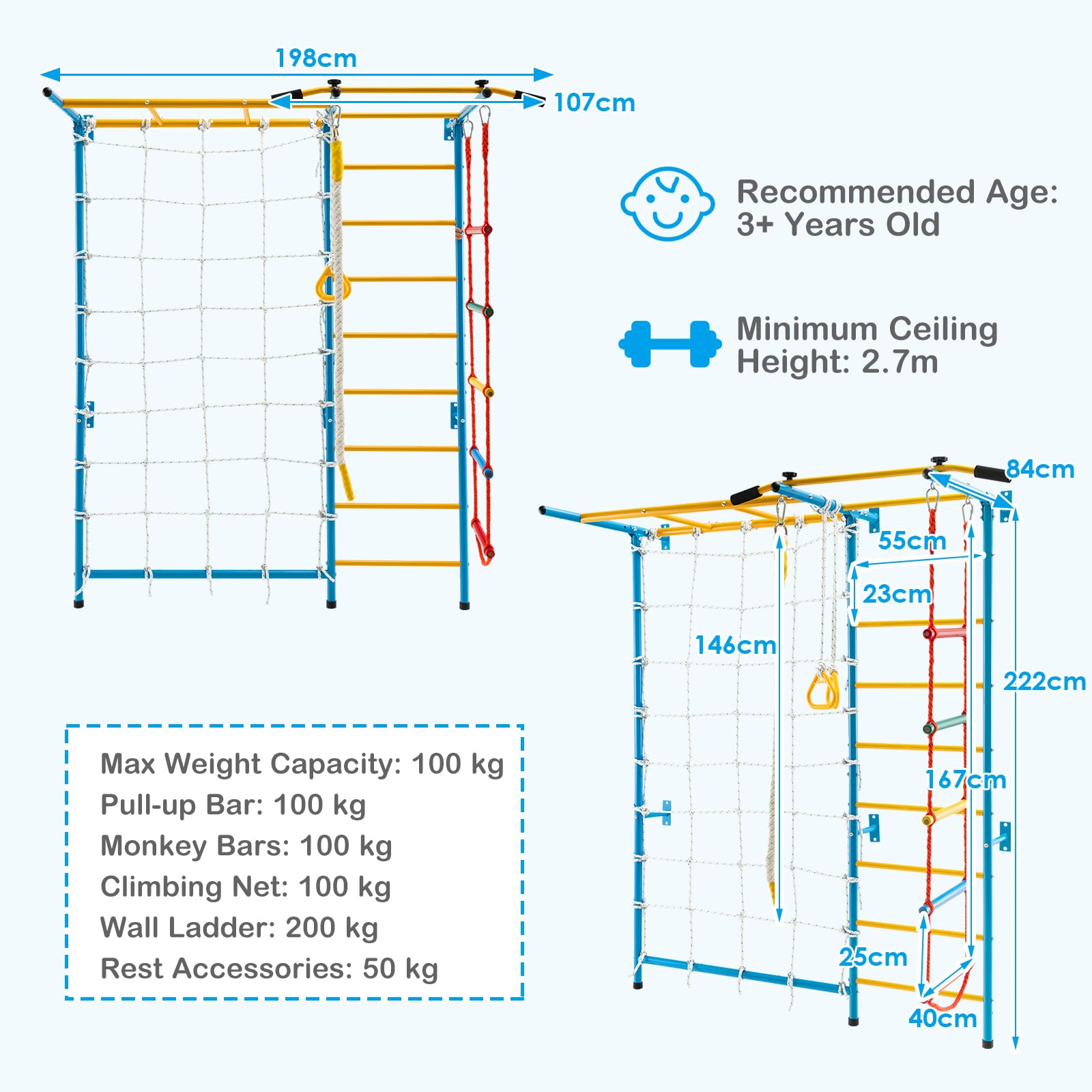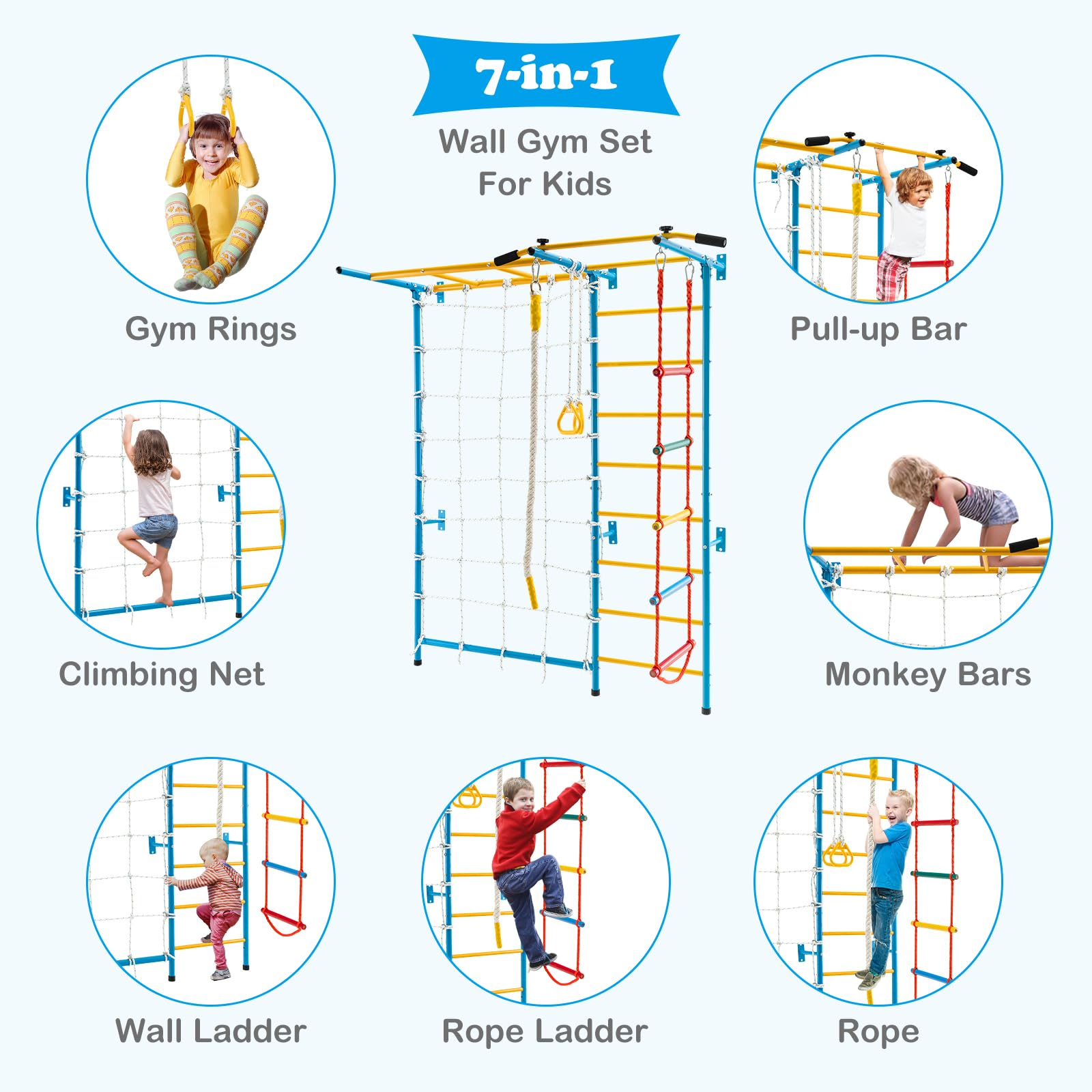 - ✔7-IN-1 COMPLETE INDOOR PLAYGROUND- This indoor jungle gym is designed with wall ladder, pull-up bar, rope ladder, rope, rope wall, monkey bars and gymnastic rings, offering multiple activities such as climbing, swinging and dangling. This indoor jungle gym is suitable for children aged 3 years and up.