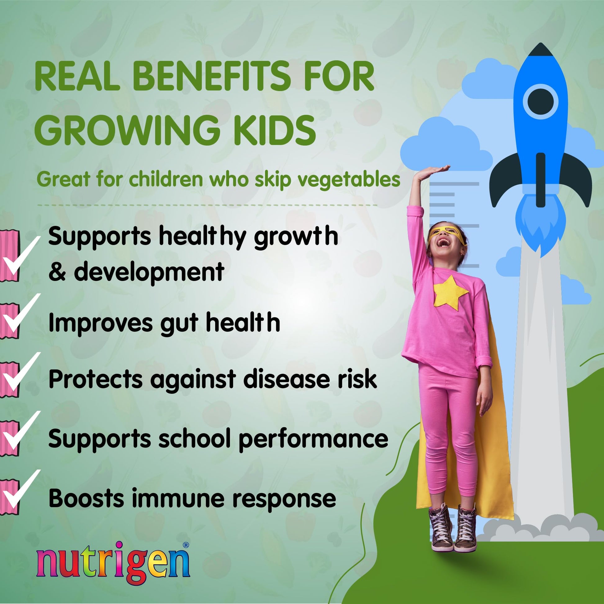 - Nutrigen Vegy Syrup provides multiple health benefits, including: o Promoting good health and protecting against diseases both now and in the future. o Ensuring healthy growth and development in children. o Reducing the risk of major chronic diseases in later life. o Providing phytonutrients needed to fight illnesses and strengthen the immune system.