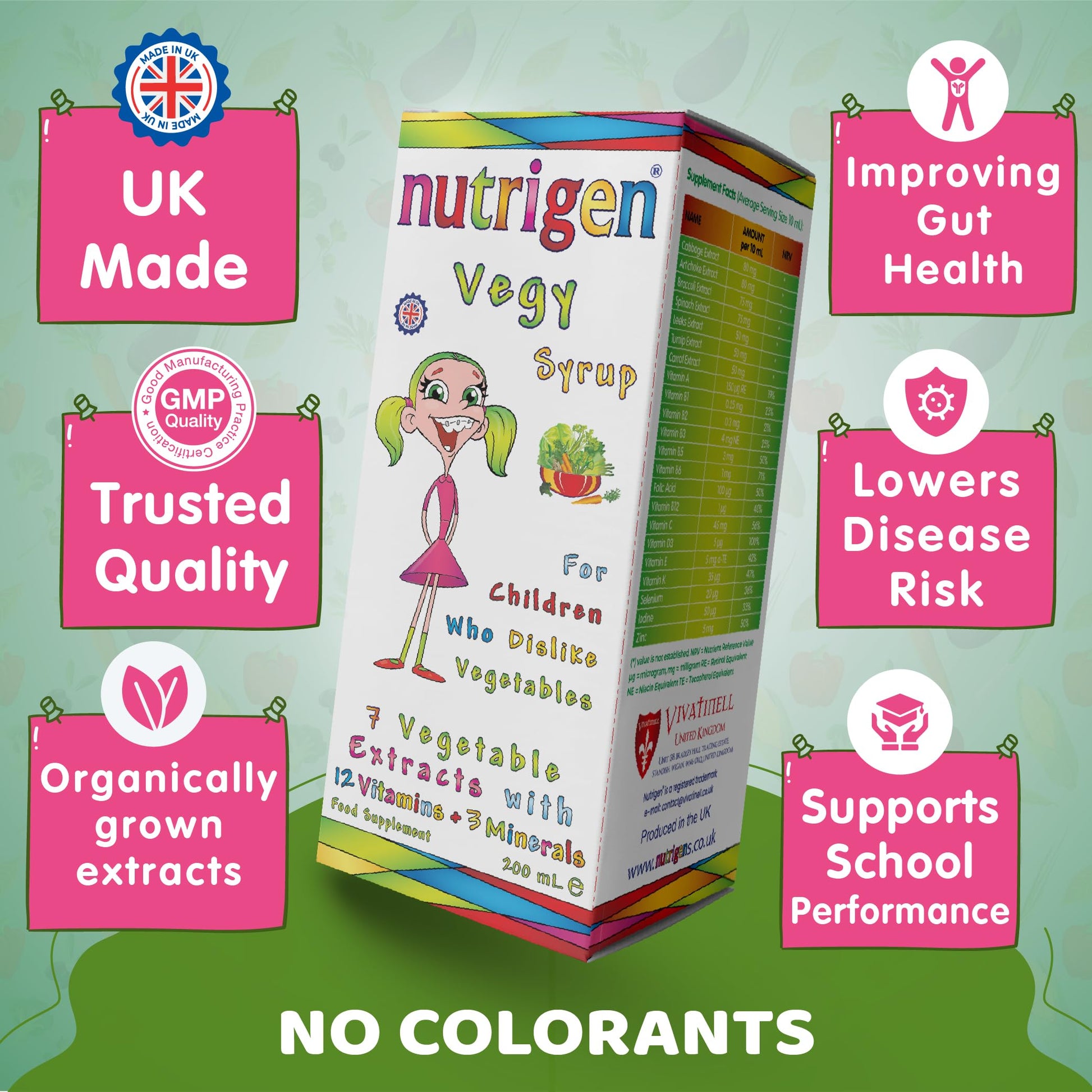 - Nutrigen Vegy Syrup is the only supplement that contains 7 vegetable extracts, enriched with 12 vitamins and 3 minerals.