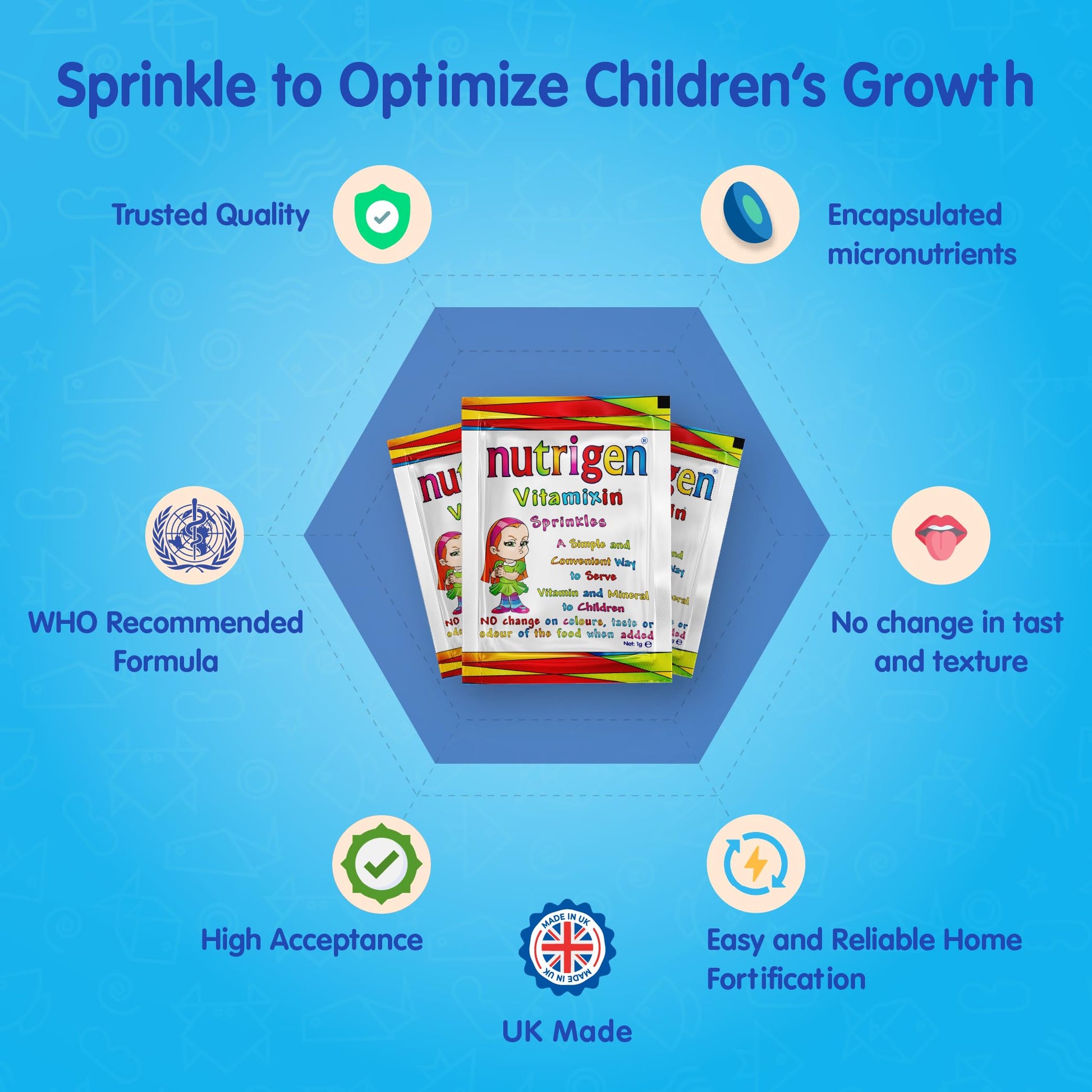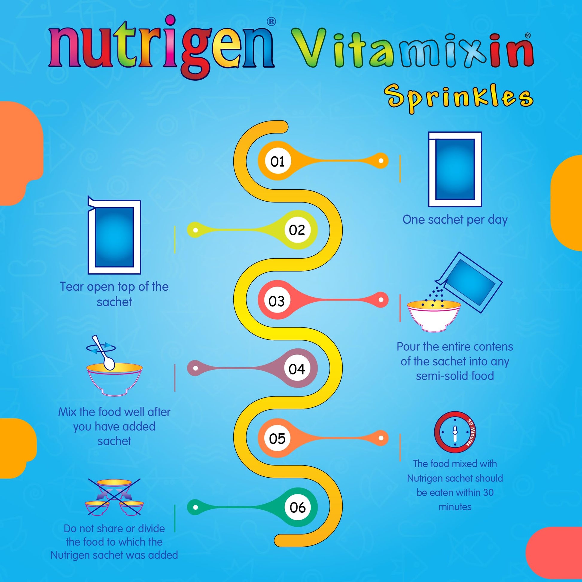 Multi micronutrient deficiencies may affect and cause problems with many of the body systems; including skeletal, skin, eye, neurological, blood and intestinal. Nutrigen Vitamixin Sprinkles sachet which enables to fortify many different home made semi-solid foods, is a multi micronutrients formulation that will help you to serve vitamin and mineral rich to your children every day. Now, you can fortify your children's food at home by adding Nutrigen Vitamixin Sprinkles onto the foods they love. You no longer need to be anxious that they will lack the vitamins and mineral they need when eating their favourite foods.