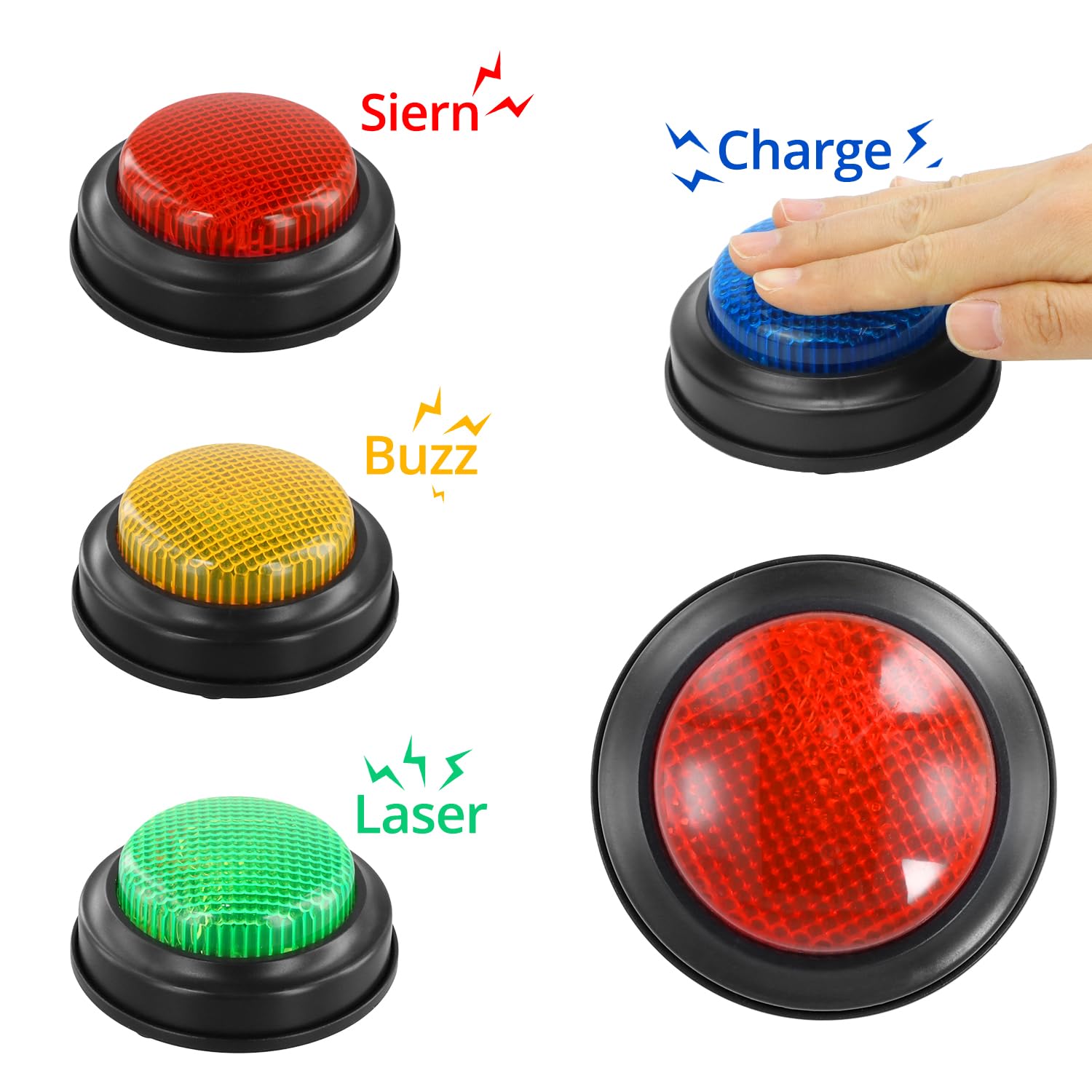 - Includes four fun and interactive buzzers, each with unique sounds: Siren, Buzz, Laser, and Charge.