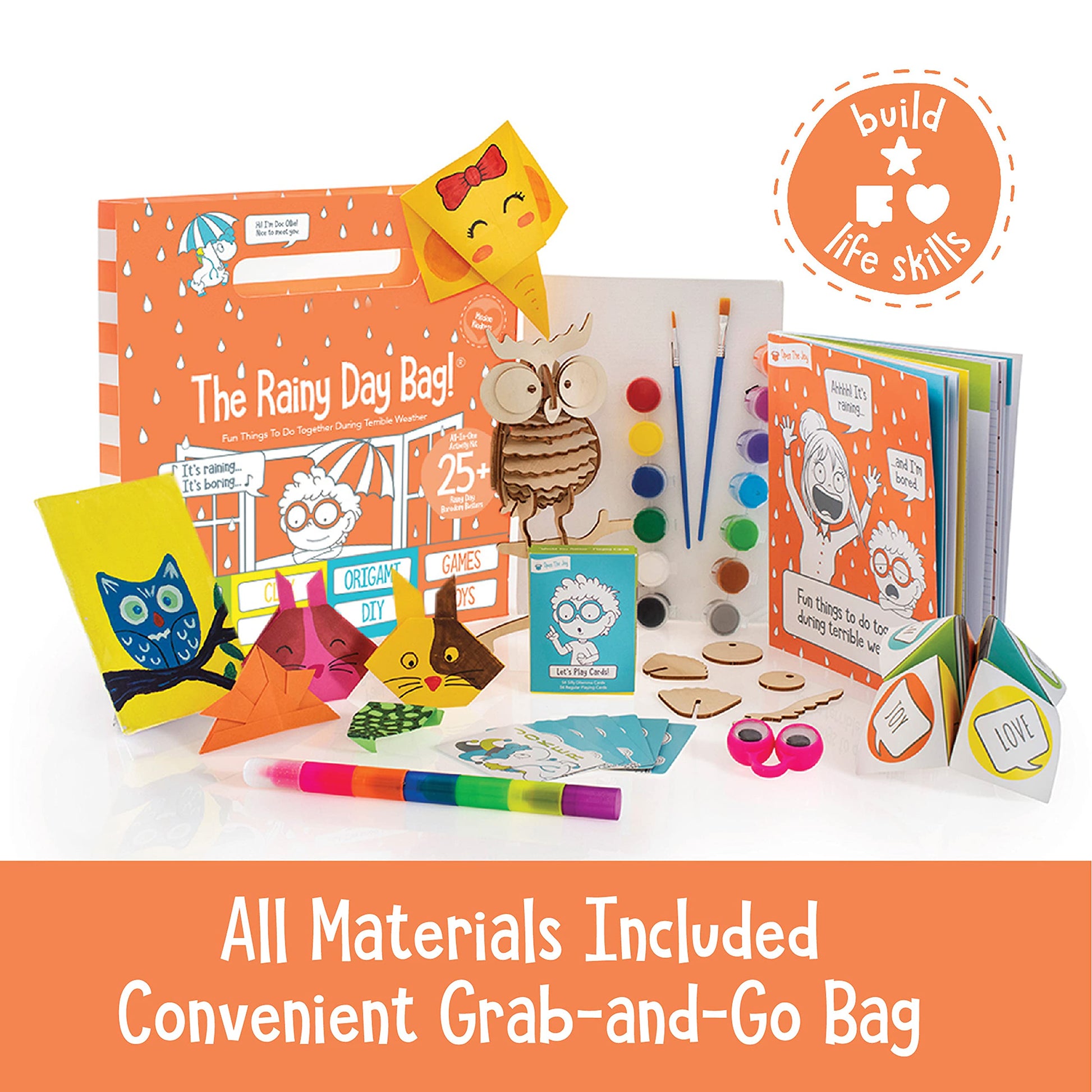 - Boredom Busters for Kids: The rainy-day box is the perfect solution to an otherwise boring day stuck inside the home, either on rainy days or hot summer days. This all-in-one activity bag includes colouring, origami, magic, paints, playing cards, a special DIY wooden owl construction kit, and much more! All materials come in the bag, no need to scramble looking for supplies.