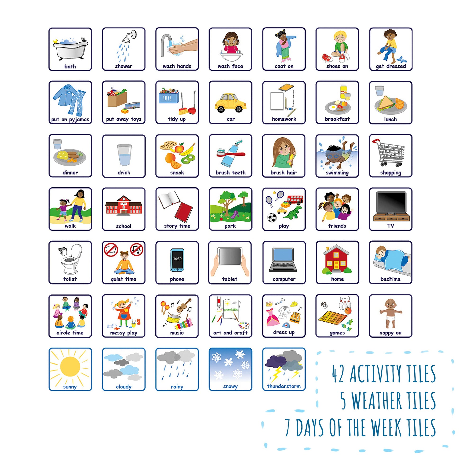 - VISUAL COMMUNICATION: Designed by former teachers, we understand how important effective and clear communication is in child development. Including clear, colourful designs in our tiles is proven to boost vocabulary, understanding and retention. Build and establish routines to increase confidence and encourage forward planning and preparation. Aiding to improve your child’s organizational skills and self-esteem.