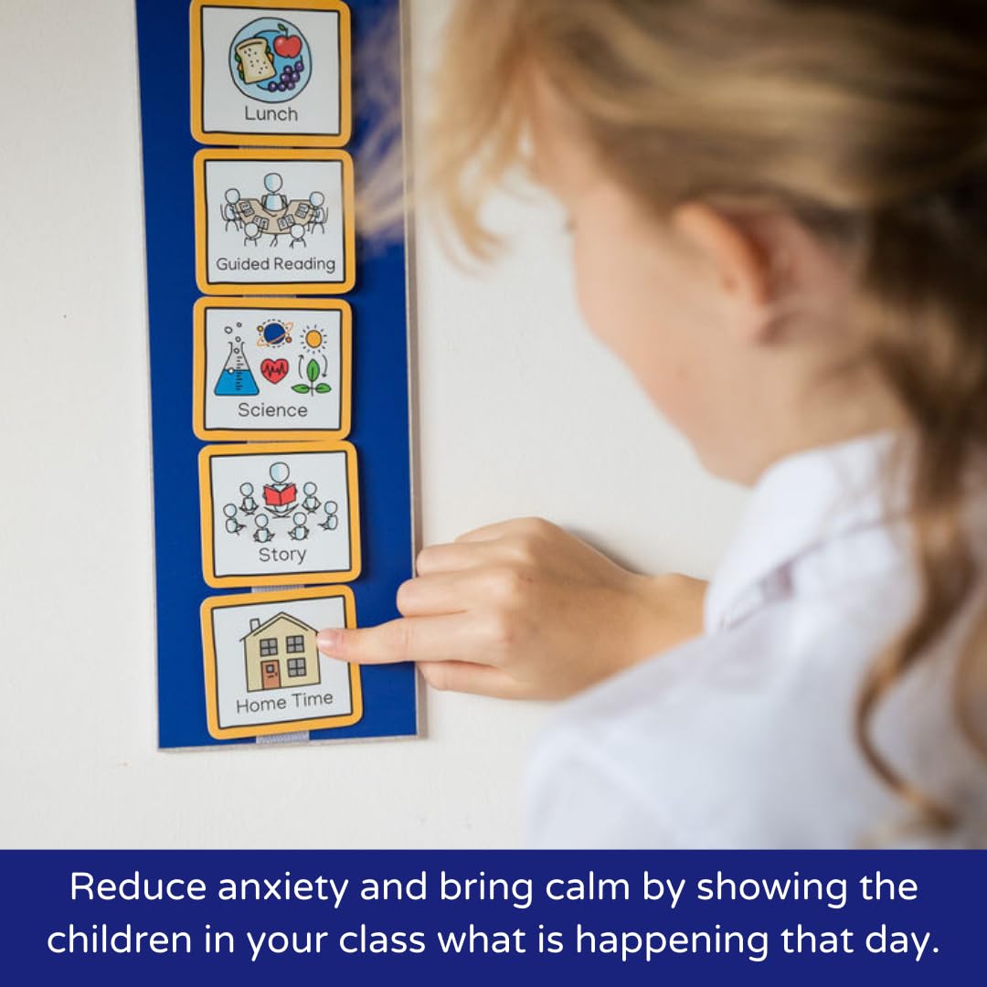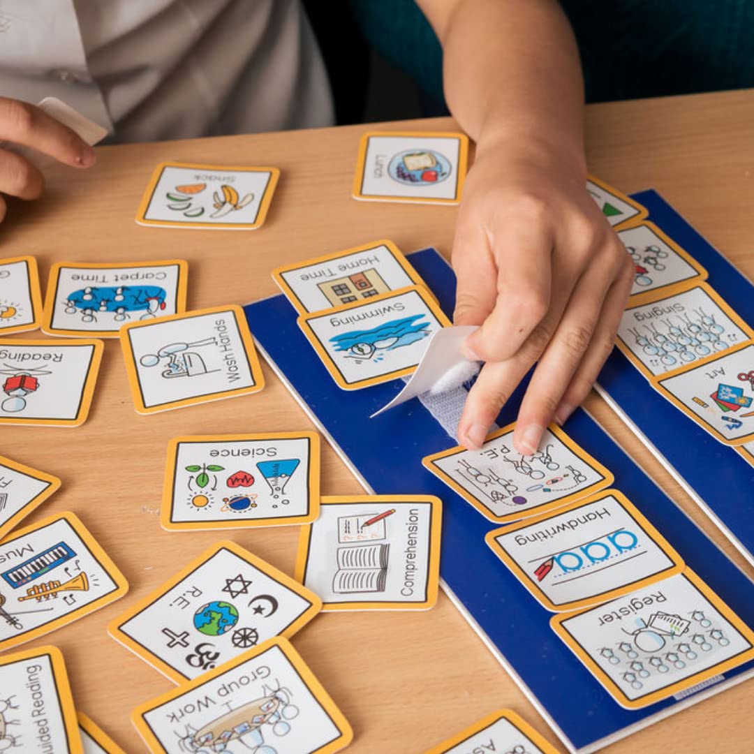 - A visual wall planner of 40 visual symbols or picture cards based around school life, plus two foamex boards which attach to one another using VELCRO Brand hook and loop.