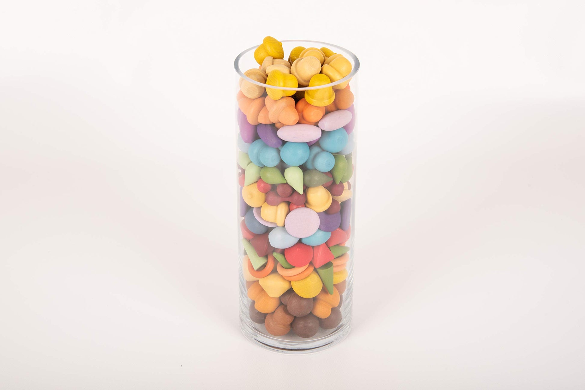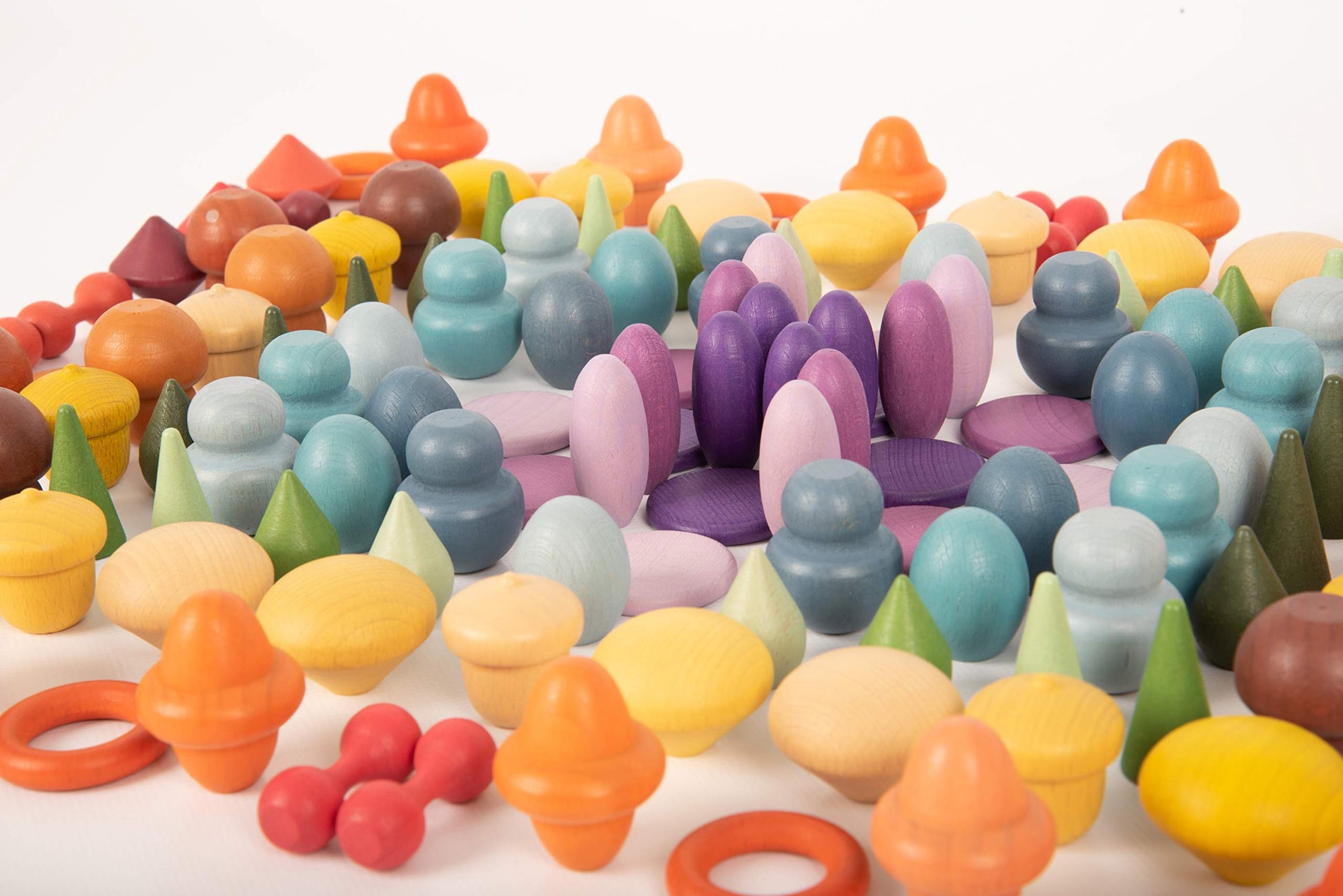 - INCLUDES -- 168 coloured wooden treasures supplied in a cotton drawstring storage bag Each of the 14 different treasures comes in 3 shades of 7 organic colours symbolising emotions and senses