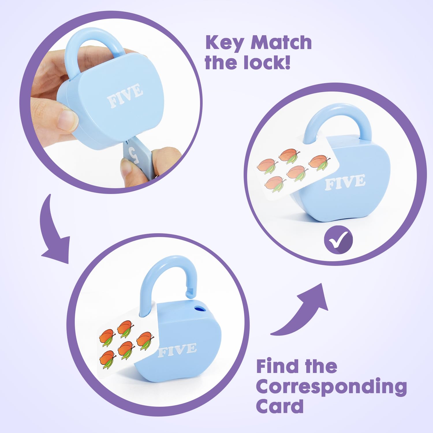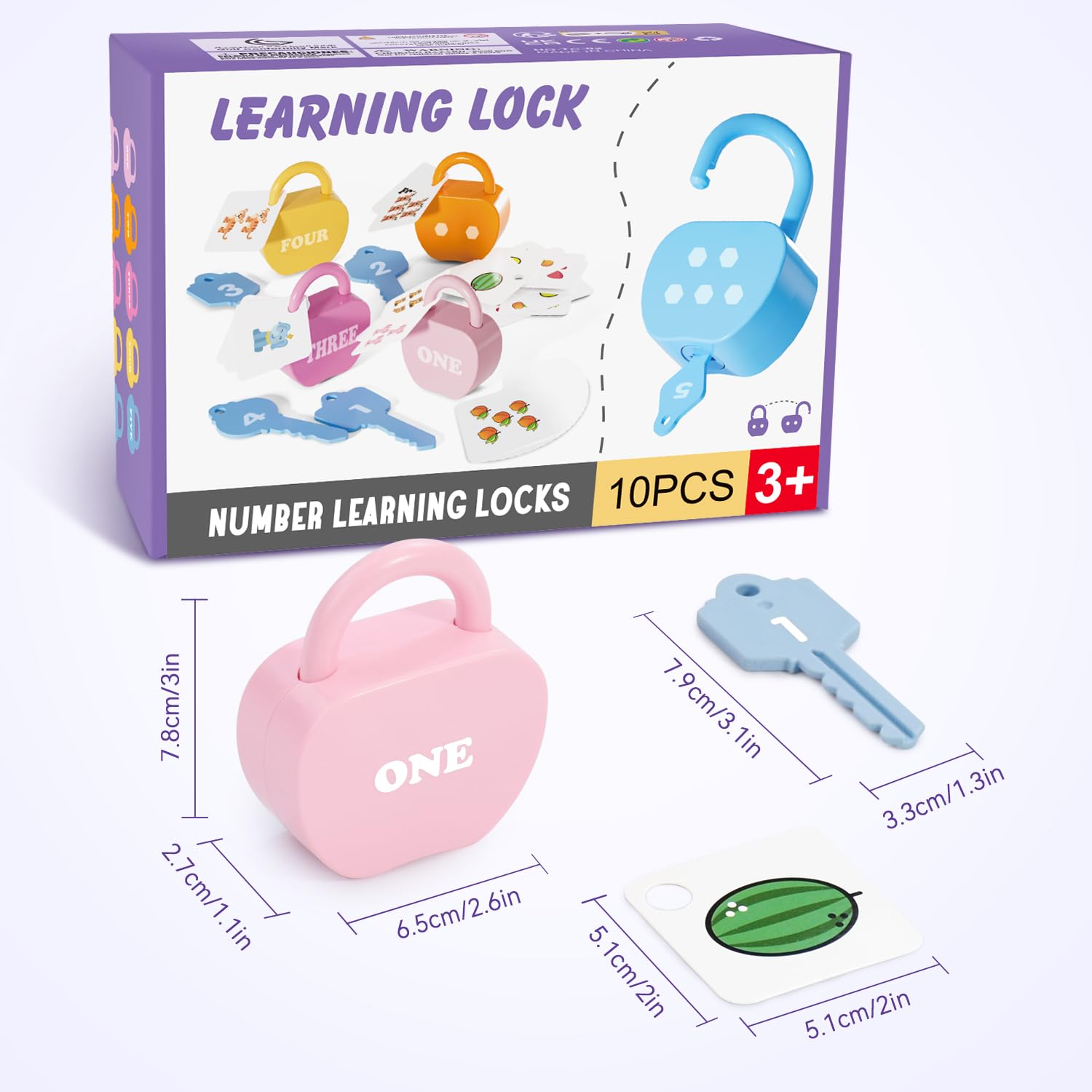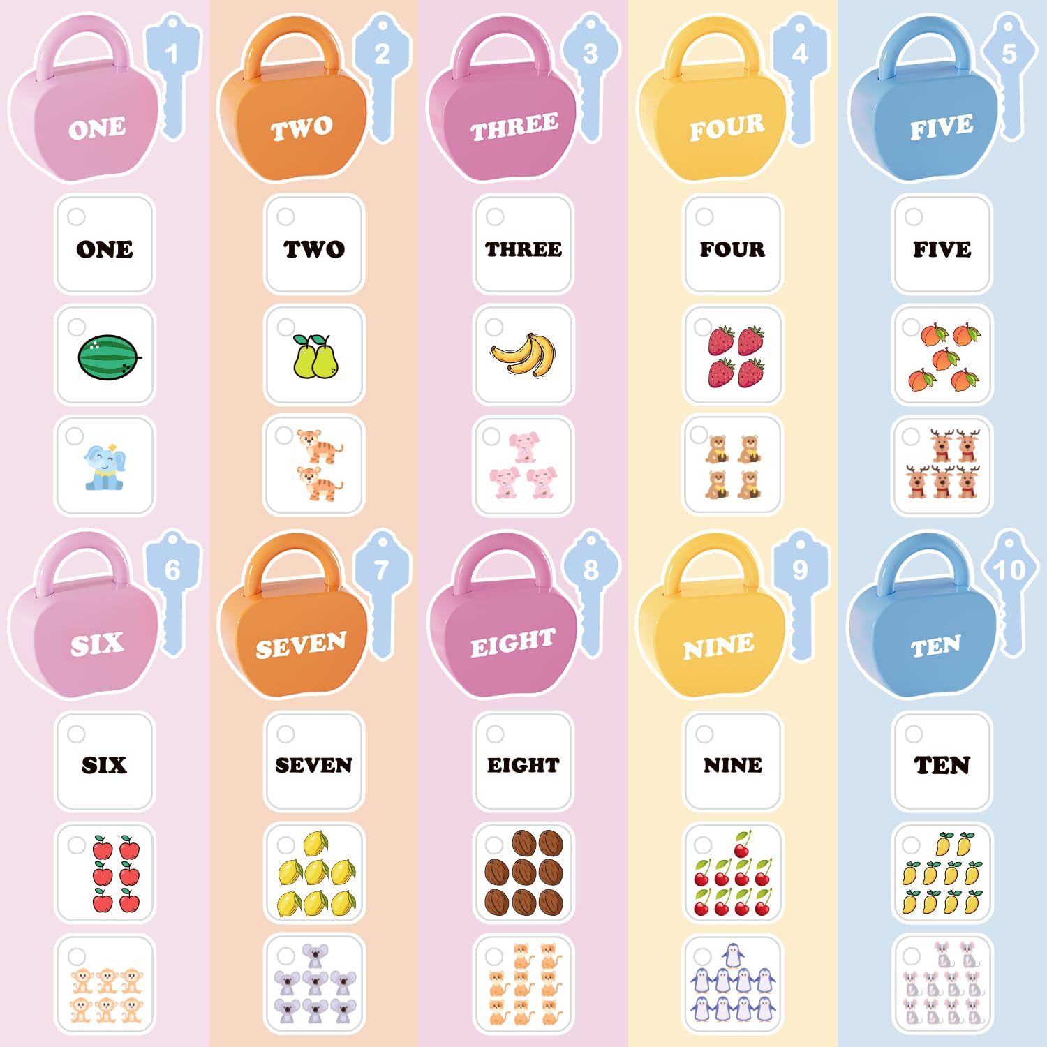 - MONTESSORI LOCKS AND KEYS: Set Includes 10 Locks, 10 keys and 20 cards. The locks printed number 1-10 and dots. For younger children, they can find the correct key to unlock the locks by counting the number of the dots; For older children, they can find the correct key soon by identify the digital on the locks.